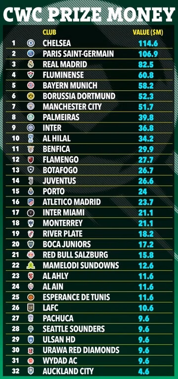 Các đội bóng lớn khác cũng không ra về tay trắng. Á quân PSG nhận được 106,9 triệu USD, trong khi Man City kiếm được 51,7 triệu USD dù bị loại từ vòng 16 đội. Cơ cấu giải thưởng của FIFA Club World Cup 2025™ được chia dựa trên hai yếu tố: phí tham dự và tiền thưởng dựa trên thành tích. Chỉ riêng việc góp mặt, các câu lạc bộ hàng đầu như Chelsea, PSG, Bayern Munich, Real Madrid và Man City đã chắc chắn nhận được ít nhất 25 triệu USD.