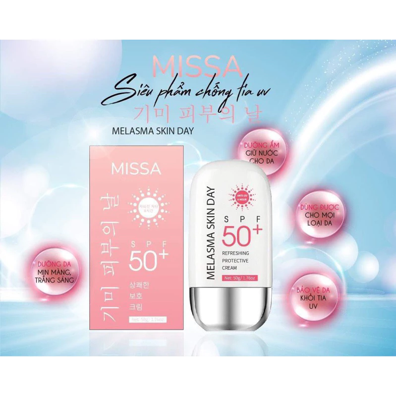 Kem chống nắng Missa được thiết kế với công thức đặc biệt, giúp tạo ra một hàng rào bảo vệ da hiệu quả trước các tia UVB và UVA. Với chỉ số SPF 50+, bạn có thể yên tâm khi ra ngoài mà không lo lắng về việc da bị hư hại do tác động của ánh nắng mặt trời.