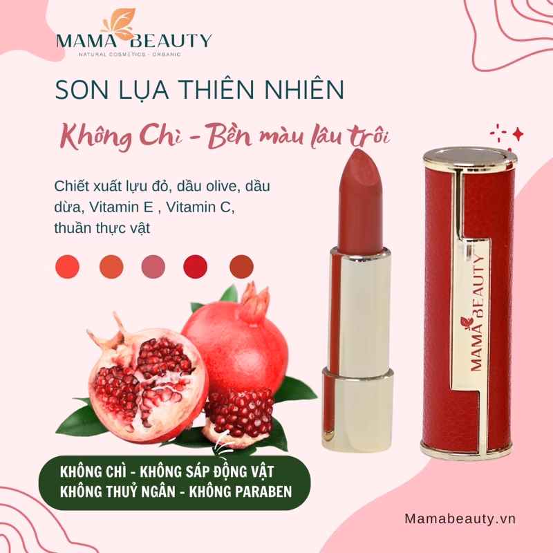 Một trong những sản phẩm son lì thiên nhiên được nhiều mẹ bầu tin dùng hiện nay là Son Lụa Thiên Nhiên Mama Beauty. Sản phẩm này được sản xuất với công thức hoàn toàn từ thiên nhiên, không chứa chì và các hóa chất độc hại, đảm bảo an toàn cho cả mẹ bầu và bé.