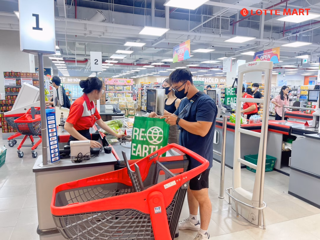 Chuỗi siêu thị Lotte Mart đã đưa vào sử dụng khay bã mía đựng thực phẩm chế biến, tươi sống từ năm 2020. Hiện hệ thống siêu thị cũng ứng dụng túi nilon sinh học và đang nghiên cứu vật liệu giấy trong đóng gói rau, củ.